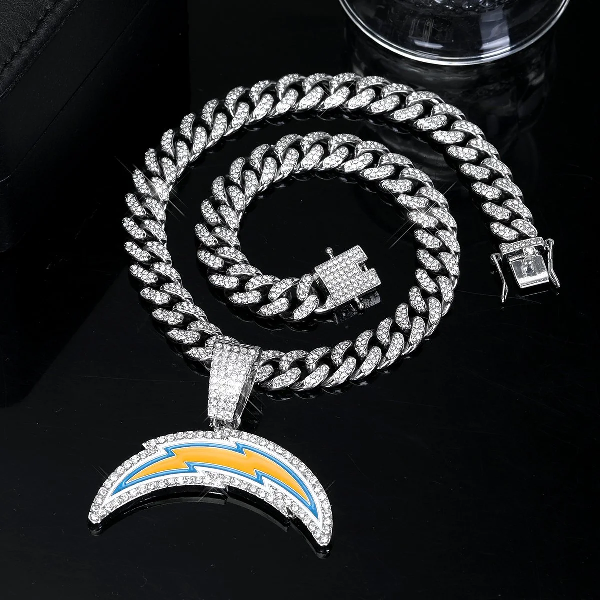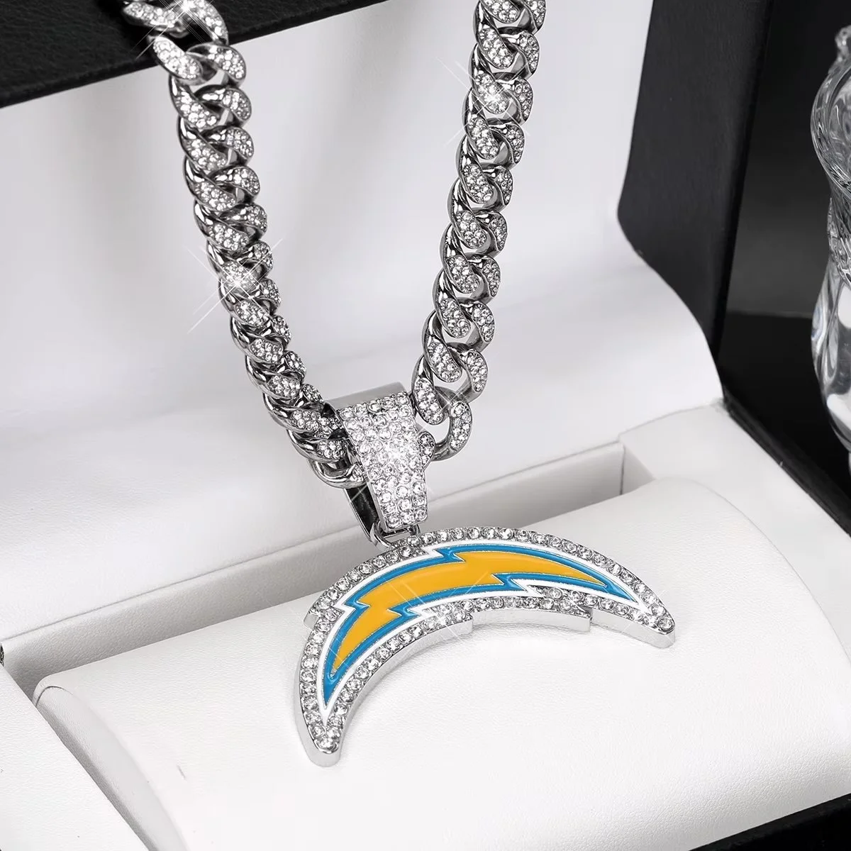Los Angeles (LA) Chargers Logo Pendant showcases an elegant and refined design, meticulously crafted to perfectly capture the dynamic spirit and proud heritage of the team. This exquisite and thoughtfully designed piece is available either with or without the stylish Cuban Link Chain Necklace, providing adaptable options for versatile wear and a personalized touch that suits any occasion.