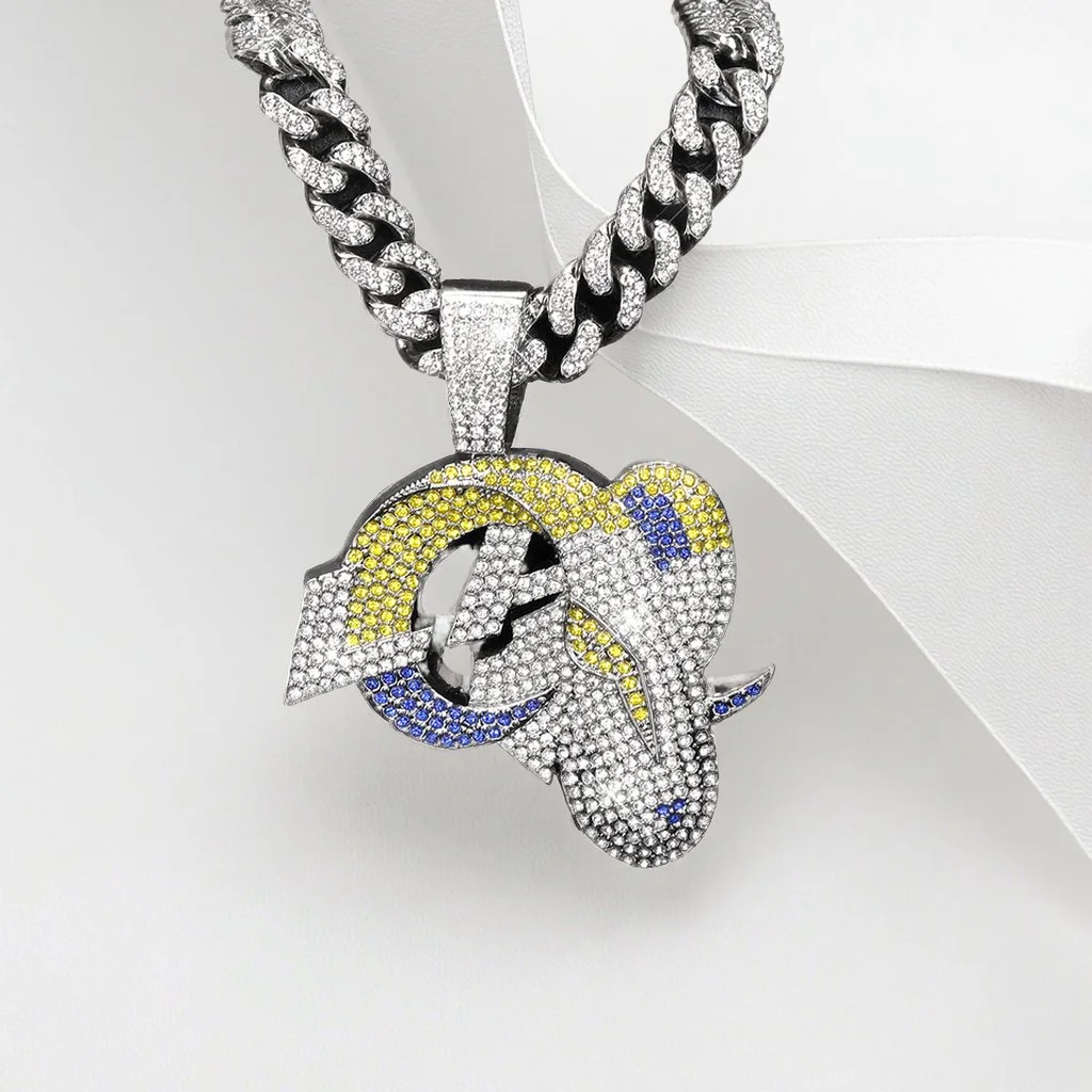 The Los Angeles (LA) Rams Logo Pendant is available either on its own or elegantly paired with the accompanying Cuban Link Chain Necklace, offering a sophisticated and versatile accessory option that effortlessly enhances and complements any ensemble with timeless style and refined flair.