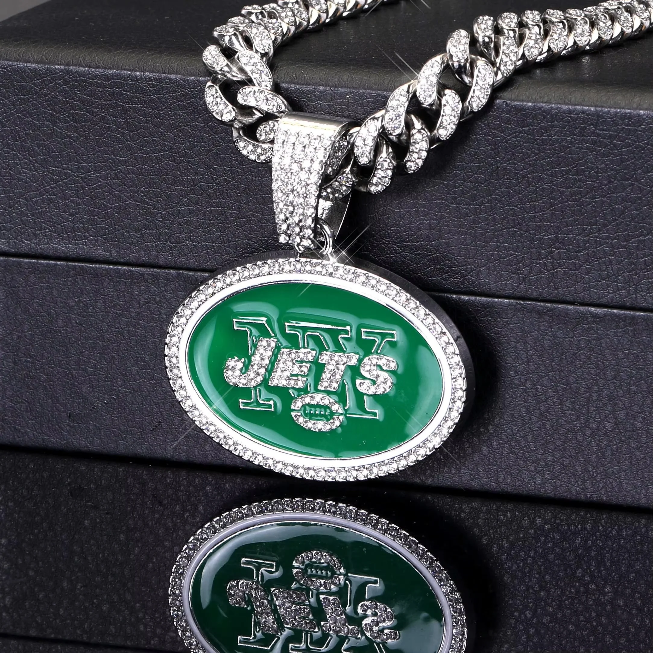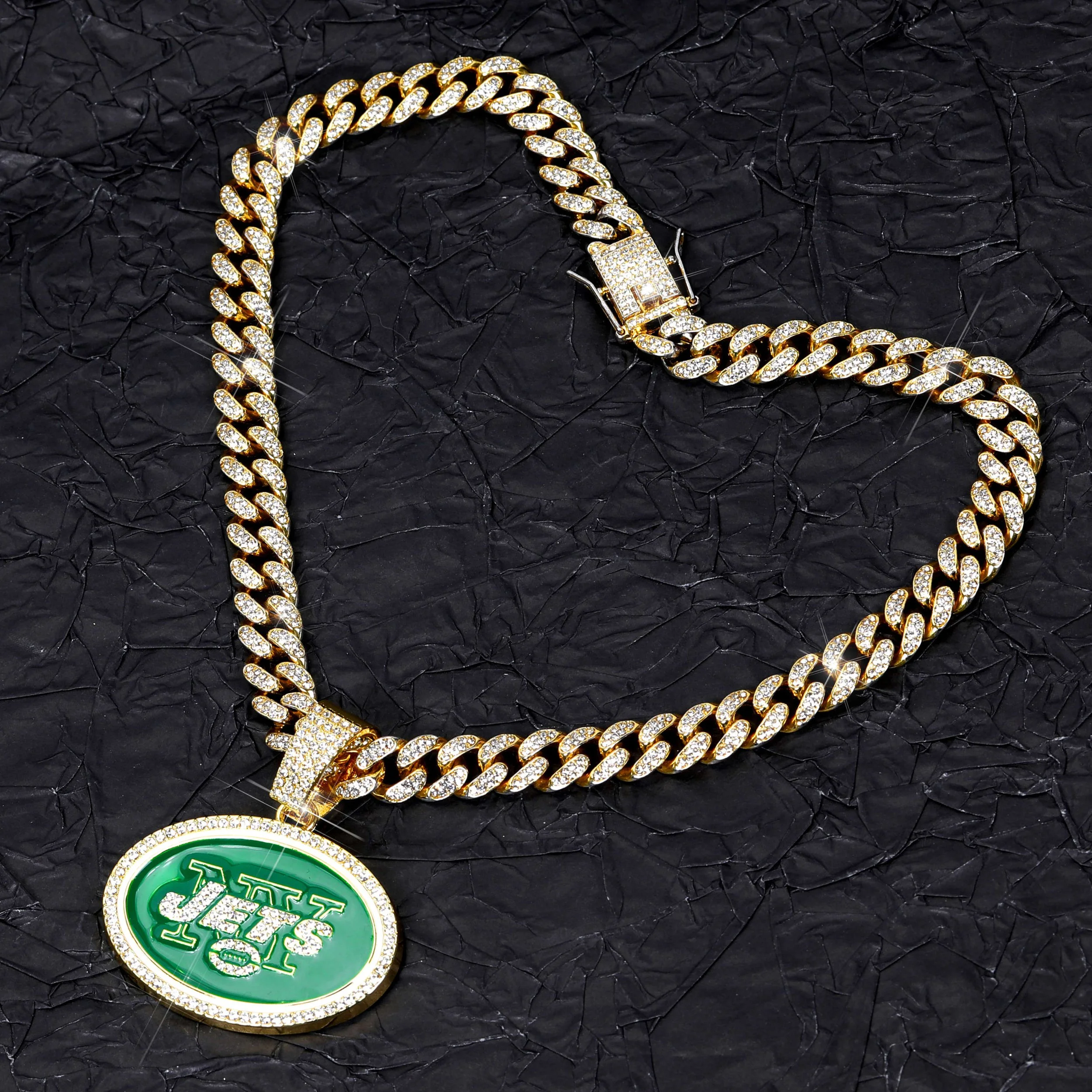 New York Jets Logo Pendant, exquisitely crafted with exceptional attention to intricate detail, and available with or without the elegant Cuban Link Chain Necklace. This carefully curated combination offers a versatile and stylish look that seamlessly complements any ensemble, effortlessly adding a refined touch of sporty sophistication and timeless elegance.