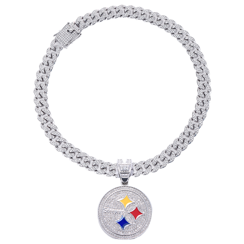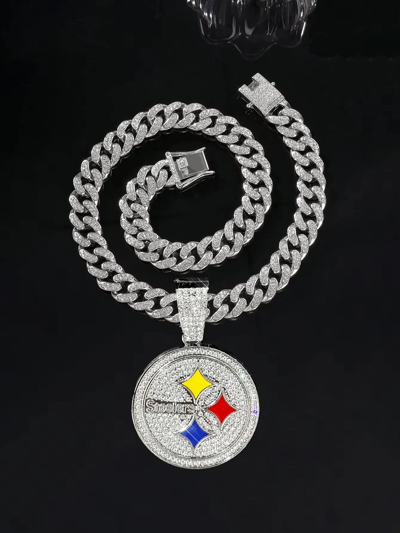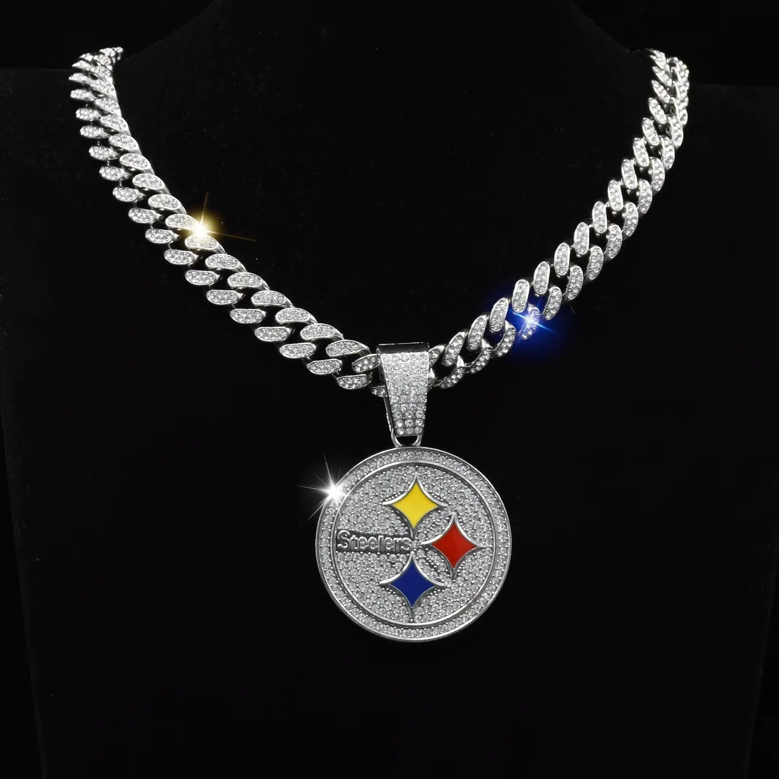 Pittsburgh Steelers Logo Pendant, exquisitely crafted with meticulous attention to detail and available with or without the elegantly designed Cuban Link Chain Necklace, offering a sophisticated and polished way to proudly showcase your unwavering team loyalty with timeless style and refined elegance.